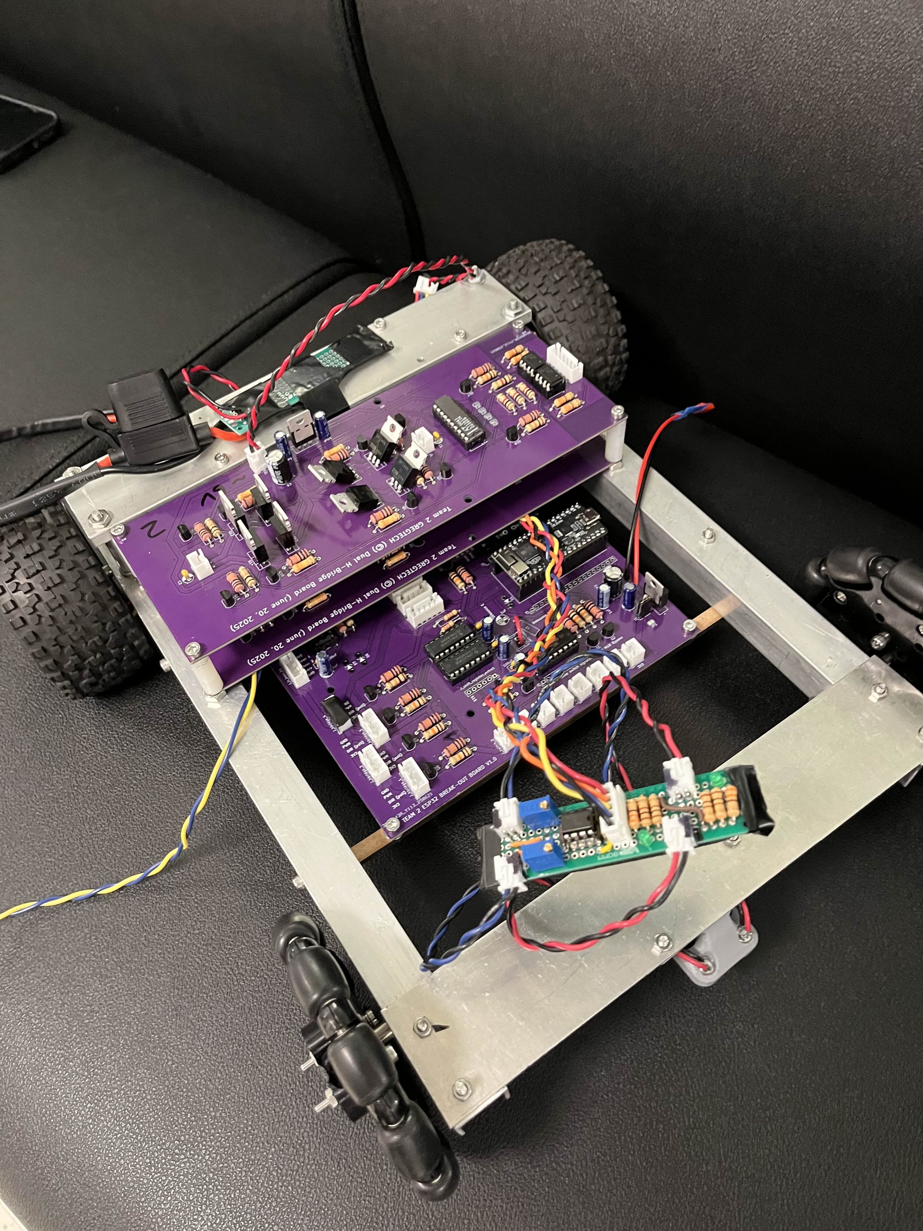 Within a week of design, we were off to building! From the shortcomings of teams from previous years, it was immediately clear that whatever we designed needed to be modular, and easily modifiable, to leave room to modify our strategy wherever needed. The Robot Lab was stocked with a wide variety of building options: A laser cutter could quickly cut pressed board, cardboard or PMMA parts or a row of Bambu printers could let you print an entire robot overnight. There was sheet metal, extruded aluminum, wood, plastic, all sorts of hardware. With weight not a concern, Taiga and I chose to build our chassis out of U-channel and bar aluminum stock, and 3D print major components of the arm. In hindsight, this gave us a few advantages over other teams, the majority of which designed their robots out of 1/8” pressed board. We could:
